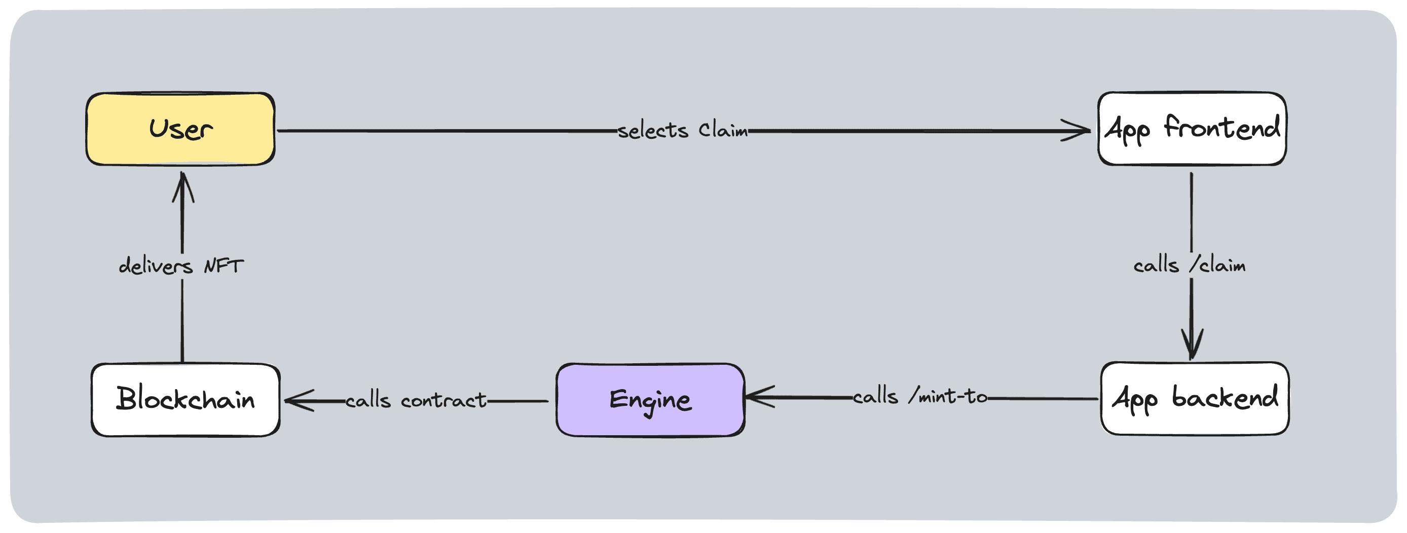 POST /api/claim calls the transactions API to send tokens to the user's wallet.